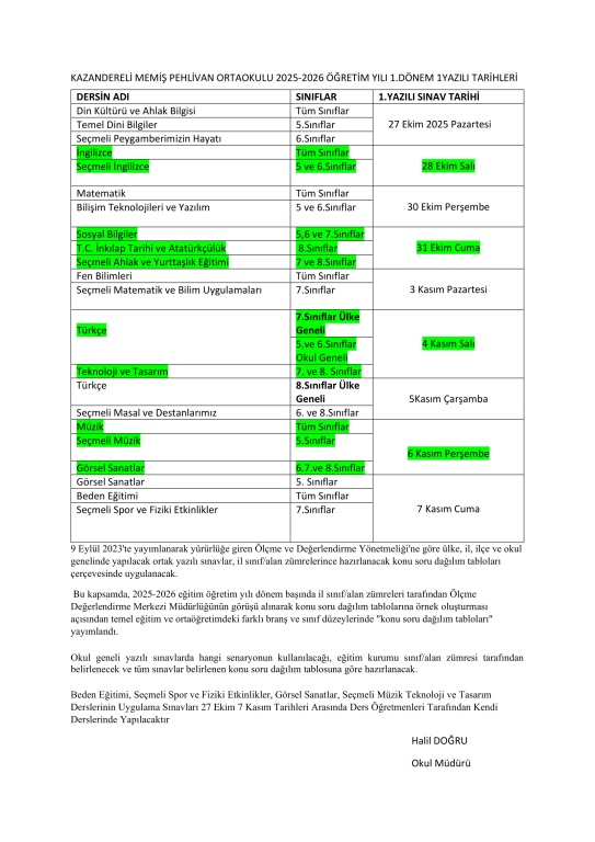 1.Dönem 1.Yazılı Sınav Tarihleri